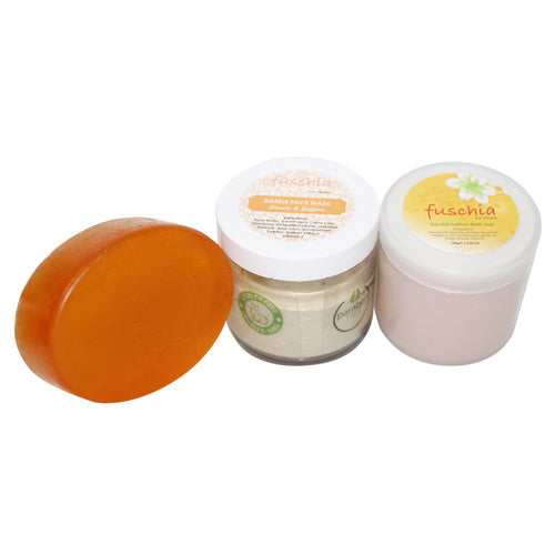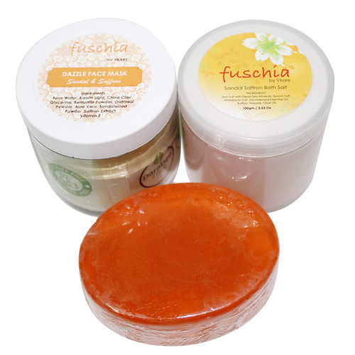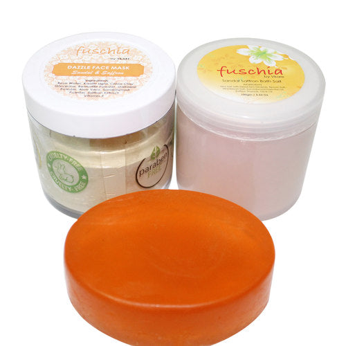 Fuschia Sandal Collection includes: Fuschia - Sandal Natural Handmade Glycerine Soap (100g) ,Fuschia Dazzle Face Mask - Sandal & Saffron (100g), Fuschia - Sandal Saffron Bath Salt (100g).