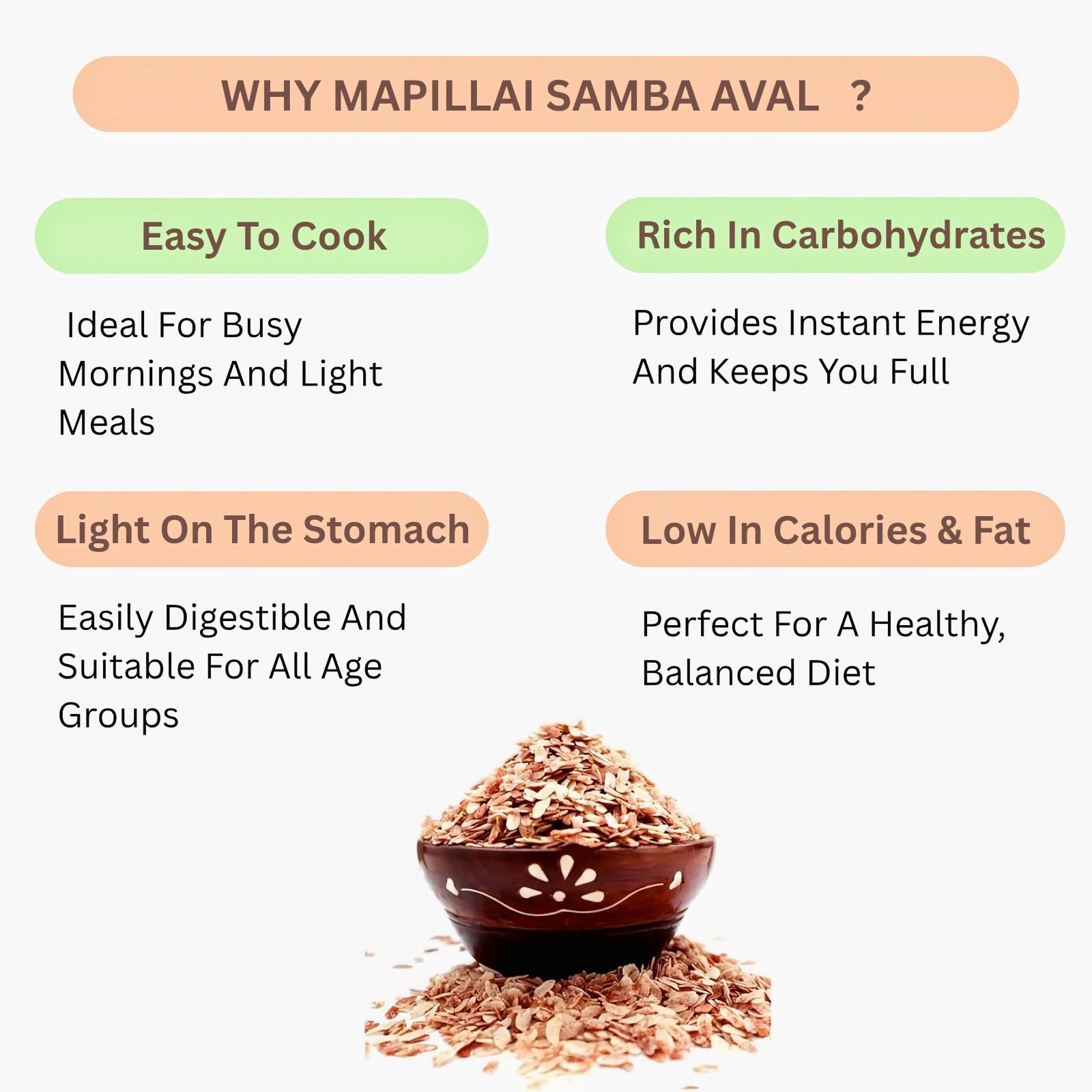 Araikkal Mapillai Samba Aval is a flattened rice (aval or poha) made from the Mapillai Samba variety of rice, a traditional red rice native to Tamil Nadu, India. "Mapillai" means groom in Tamil, and this rice is traditionally believed to boost strength and stamina, making it a popular food for grooms and those involved in physically demanding tasks.