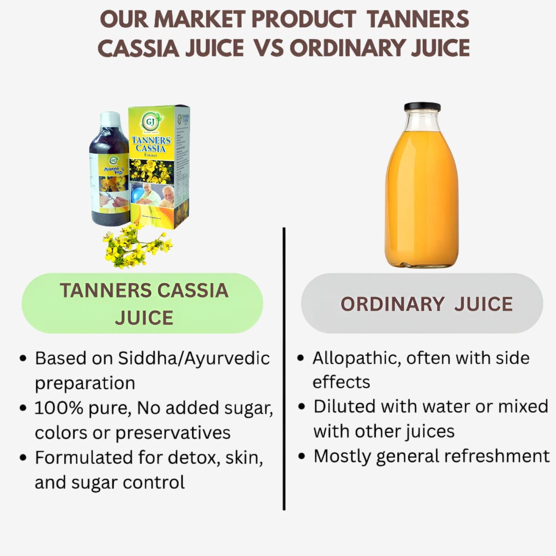 Tanners Cassia Extract Juice is a traditional Ayurvedic herbal drink made from the leaves of the Tanners Cassia plant (Cassia auriculata). Known for its skin-purifying and metabolic support properties, this juice is especially valued in Ayurvedic routines for promoting skin health, managing blood sugar, and supporting urinary wellness.