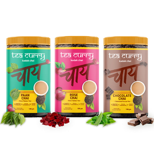 Teacurry Flavored Chai Combo Pack (3x100 Grams) – Paan, Rose, Chocolate