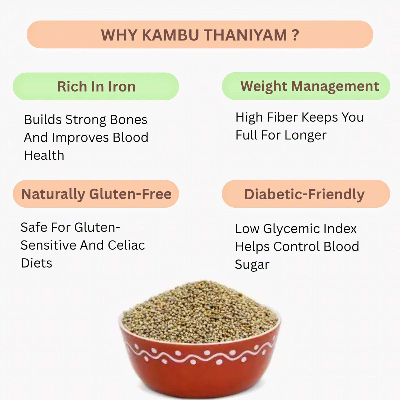 Araikkal Kambu Millet (also known as Pearl Millet) is a highly nutritious and versatile grain, commonly used in various parts of India, Africa, and other regions.