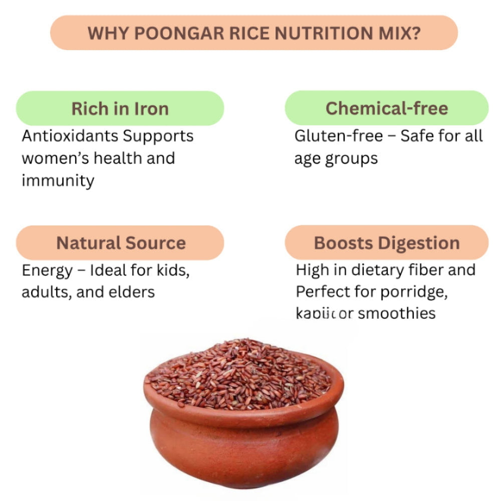 Poongar Rice Nutrition Mix is a wholesome health blend made from Poongar rice, a traditional Tamil Nadu rice variety known for its medicinal benefits, especially for women’s health. This mix combines the nutritional power of heritage rice with pulses and spices to create a nourishing drink or porridge suitable for all ages.