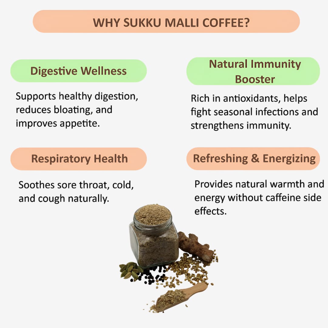 - Caffeine-Free: Unlike traditional coffee, Sukku Malli Coffee does not contain caffeine, making it a great option for those who want to avoid stimulants.