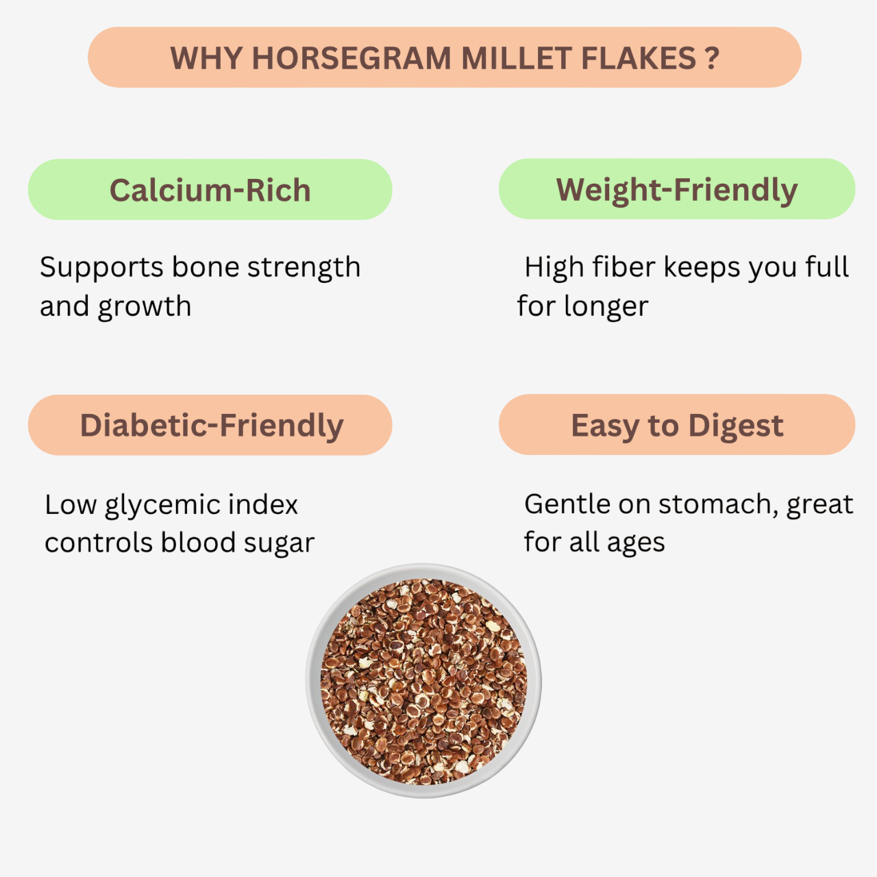 Horsegram Millet Flakes are made by flattening cooked horsegram seeds, often combined with millet to enhance the overall nutritional profile. Horsegram itself is a drought-tolerant legume widely grown in tropical and subtropical regions, particularly in India and Africa, and has been traditionally consumed for its healing properties.These flakes are also ideal for people looking to manage their weight or those seeking heart-healthy, high-protein, and high-fiber foods. As a sustainable and nutrient-dense food, horsegram millet flakes can be a valuable addition to a modern, health-conscious diet.