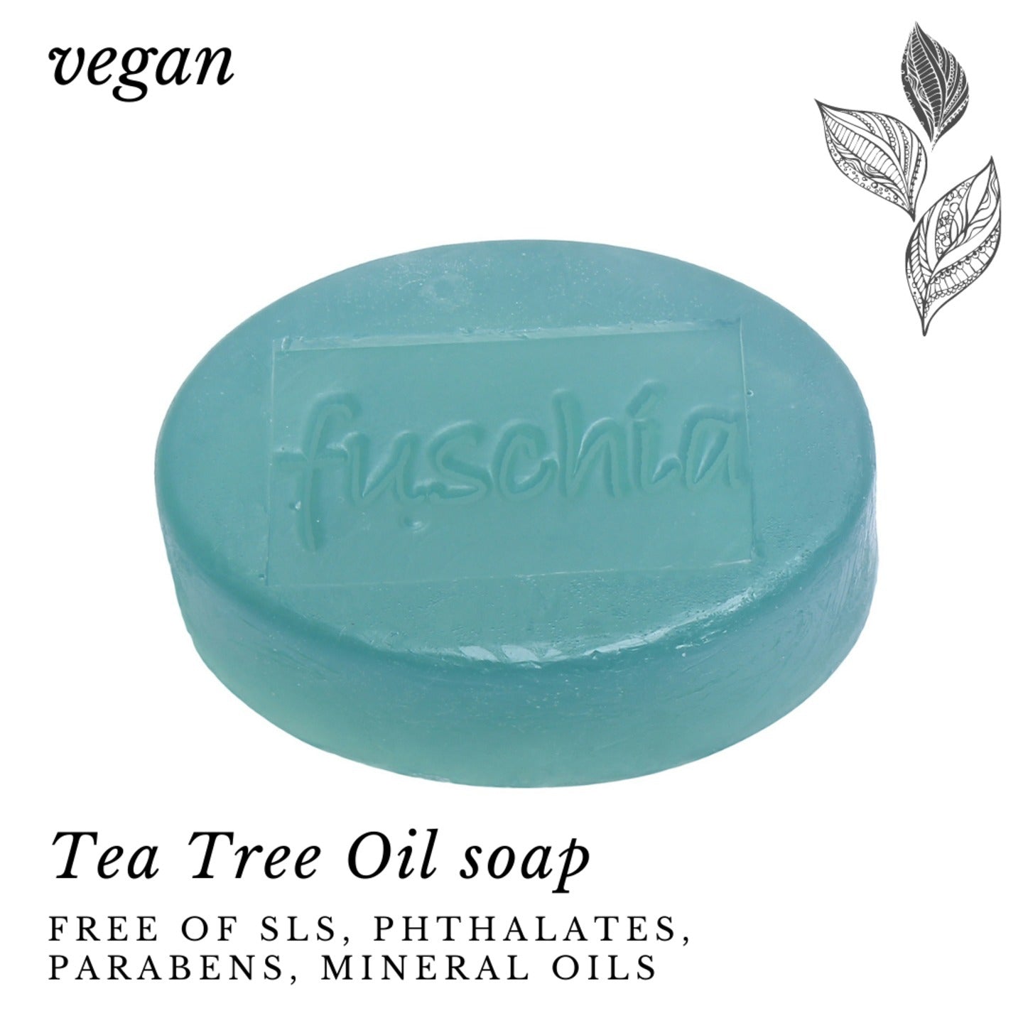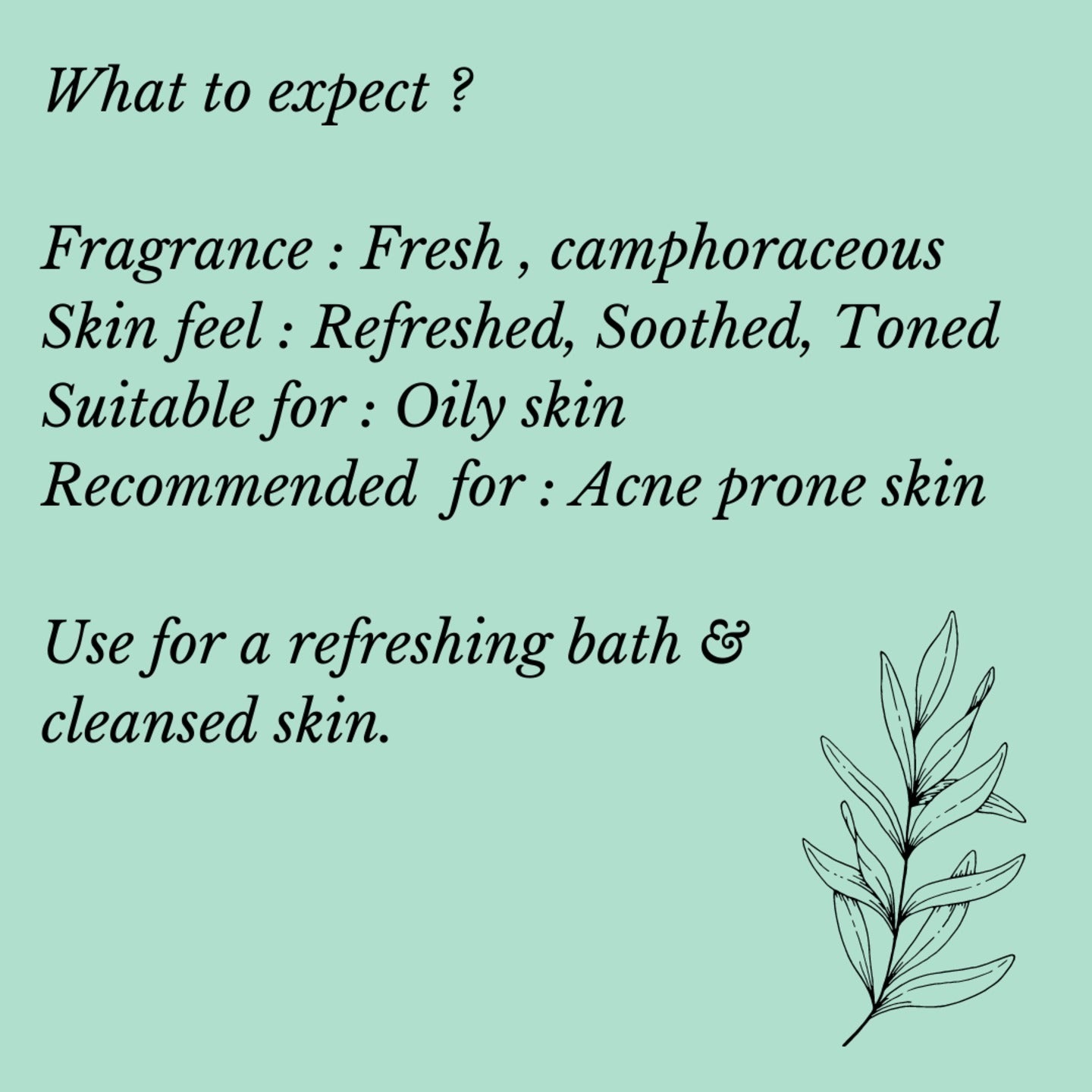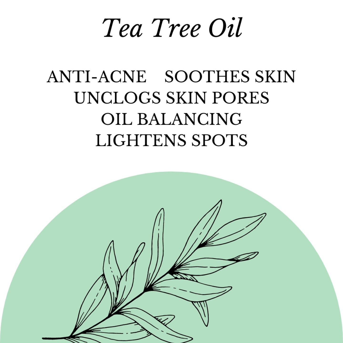 தேயிலை மர எண்ணெய் ஒரு மிருதுவான, சுத்தமான வாசனையை அளிக்கிறது மற்றும் அதன் இயற்கையான குணப்படுத்தும் பண்புகளுடன் சருமத்தை மென்மையாக்குகிறது. தேயிலை மர சோப்பு முகப்பரு பாதிப்புக்குள்ளான சருமத்திற்கு இயற்கையான மாற்றாகும். இது கரிம தேயிலை மர எண்ணெயின் கிருமி நாசினிகள் பண்புகளுடன் கறைகளைத் தடுக்கிறது. தேயிலை மர எண்ணெய் பாக்டீரியா, பூஞ்சை மற்றும் வைரஸ்களின் வளர்ச்சியைத் தடுக்கும் மற்றும் கொல்லும் திறன் காரணமாக மனிதனுக்குத் தெரிந்த வலிமையான இயற்கை கிருமி நாசினிகளில் ஒன்றாகக் கருதப்படுகிறது, மேலும் இது வெட்டுக்கள், கீறல்கள் மற்றும் பல்நோக்கு பாக்டீரியா எதிர்ப்பு மற்றும் முகத்திற்கு ஒரு சிறந்த மருத்துவ சோப்பை உருவாக்குகிறது. தினசரி பயன்பாட்டிற்கான சோப்பு.