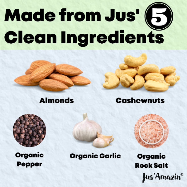 • வெறும் 5 பொருட்கள் (அனைத்தும் இயற்கை) : முந்திரி, பாதாம், ஆர்கானிக் பூண்டு, ஆர்கானிக் மிளகு, ஆர்கானிக் கல் உப்பு