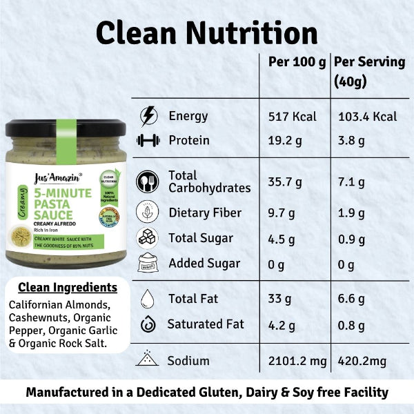 இந்த கிரீமி, பால் இல்லாத வெள்ளை பாஸ்தா சாஸ் 85% நட்ஸ் (முந்திரி மற்றும் பாதாம்), சேர்க்கைகள் / செயற்கை சுவைகள் அல்லது இரசாயனங்கள் இல்லாமல் நிரம்பியுள்ளது!