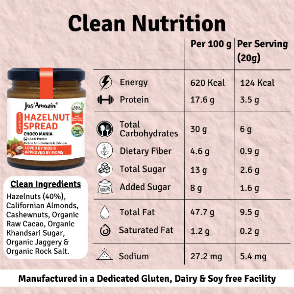“இந்த சுவையான மற்றும் சத்தான புரதம் பேக் செய்யப்பட்ட ஹேசல்நட் ஸ்ப்ரெட் / வெண்ணெய் (18% புரதம்), பிரீமியம் ஹேசல்நட்ஸ், பாதாம், முந்திரி (அனைத்தும் சேர்த்து 80%), ஆர்கானிக் மூல கொக்கோ (ஆன்டி-ஆக்ஸிடன்ட்கள் நிரம்பியது), ஆர்கானிக் ரா சர்க்கரை, கரிம கல் உப்பு மற்றும் வேறு எதுவும் இல்லை! இது மேக்ரோ-ஊட்டச்சத்துக்கள் (அதிக புரதம், உணவு நார்ச்சத்து மற்றும் ஆரோக்கியமான கொழுப்புகள்) மற்றும் நுண்ணூட்டச்சத்துக்கள் (விட் பி2, வைட்டமின் இ, கால்சியம், இரும்பு, துத்தநாகம்) ஆகியவற்றால் நிரம்பியுள்ளது. தோசை, ஸ்மூத்தியில், பழங்களுக்கு டிப் அல்லது ஓட்மீல் / மியூஸ்லியுடன் கலந்து சாப்பிடுவது நல்லது. ஹைட்ரஜனேற்றப்பட்ட கொழுப்புகள், பூஜ்ஜிய சுத்திகரிக்கப்பட்ட சர்க்கரை, பூஜ்ஜிய செயற்கை பாதுகாப்புகள் மற்றும் இரசாயனங்கள் இல்லாமல் தயாரிக்கப்படுகிறது, இந்த ஆரோக்கியமான ஹேசல்நட் பரவல் 100% இயற்கையானது! இது ஜீரோ கொலஸ்ட்ரால் மற்றும் பால் இல்லாதது, சோயா இல்லாதது, வேர்க்கடலை இல்லாதது, பசையம் இல்லாதது மற்றும் சைவ உணவு உண்பவர்களுக்கு ஏற்றது.